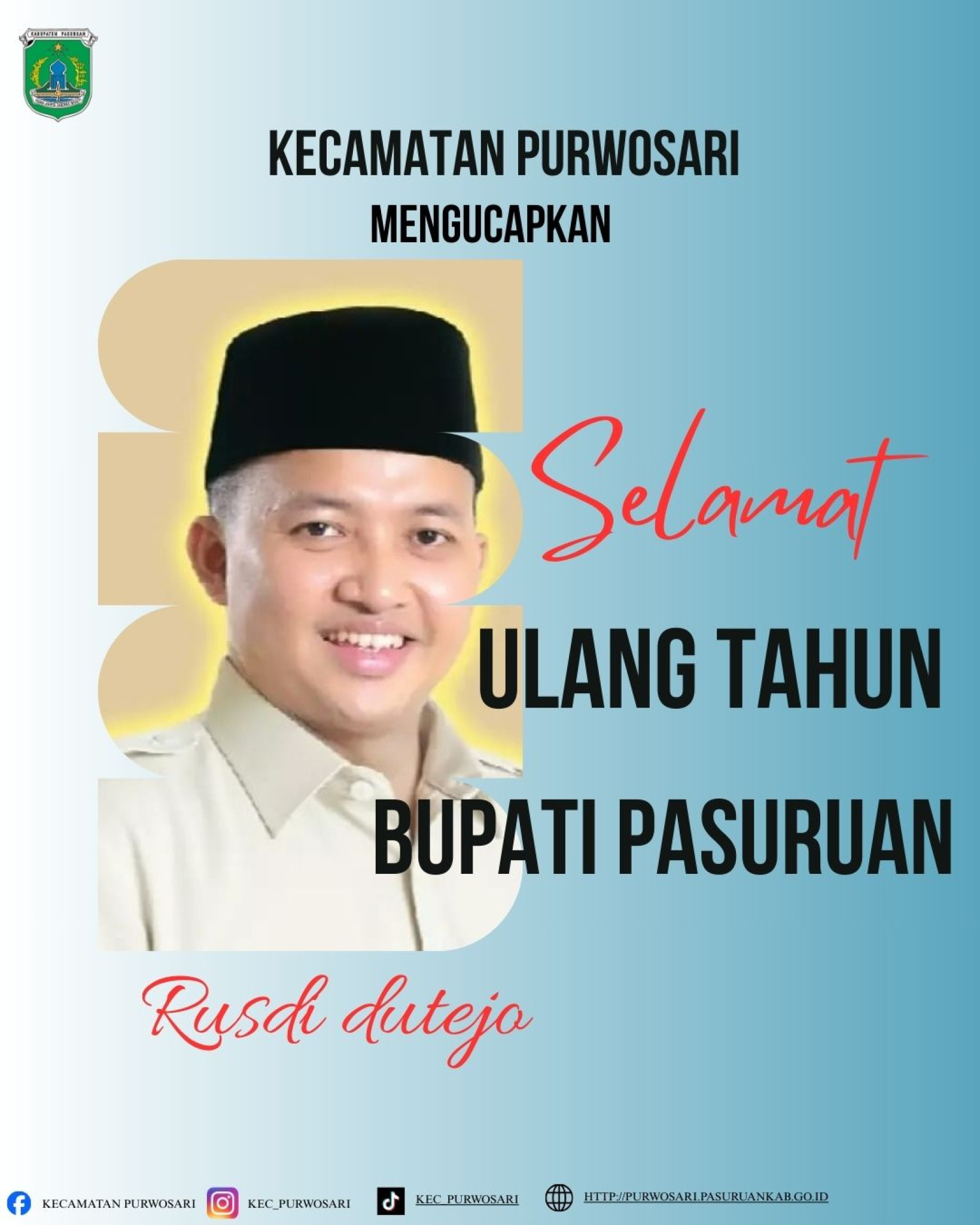 Keluarga besar Kecataman Kecamatan Purwosari mengucapkan selamat ulang tahun bapak Bupati Pasuruan. semoga senantiasa diberi kesehatan, umur panjang, dan keberkahan dalam dalam memimpin serta mengabdi untuk kemajuan Kabupaten Pasuruan.